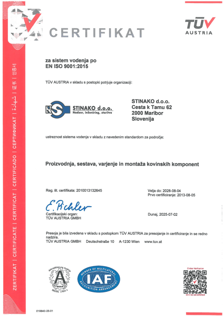 S pridobljenim standardom EN ISO 9001 vključujemo zahteve za sistem vodenja kakovosti, katere kot organizacija izpolnjujemo za doseganje zadovoljstva naših naročnikov.
